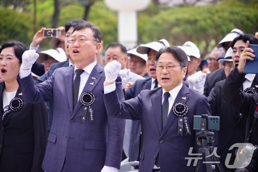 강기정 광주시장이 17일 국립5·18민주묘지에서 열린 ‘제45주년 5·18민주화운동 추모식’에 참석해 임을 위한 행진곡을 제창하고 있다.(광주시 제공. 재판매 및 DB 금지) 2025.5.17/뉴스1