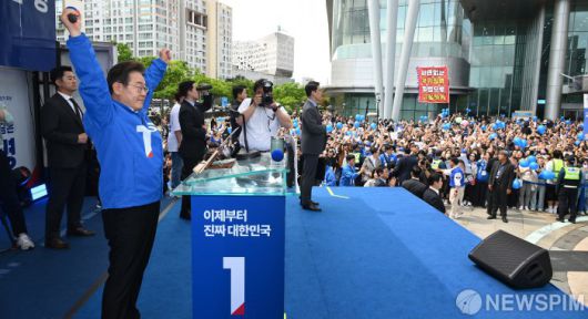 [광주=뉴스핌] 이형석 기자 = 이재명 더불어민주당 대선 후보가 17일 수많은 인파가 운집한 광주 서구 김대중컨벤션센터 광장에서 지지를 호소하고 있다. 2025.05.17 leehs@newspim.com |