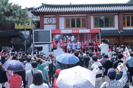 [전주=뉴스핌] 이길동 기자 =김문수 국민의힘 대선 후보가 17일 오후 전북 전주 완산구 전동성당 앞에서 유세하고 있다. 2025.05.17 gdlee@newspim.com