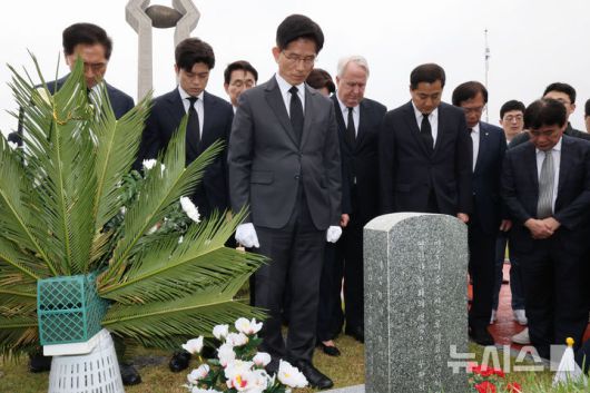 [광주=뉴시스] 조성봉 기자= 김문수 국민의힘 대통령 후보가 17일 오전 광주 북구 5.18민주묘지를 찾아 무명열사의 묘역에서 묵념을 하고 있다.(공동취재) 2025.015.17. pphoto@newsis.com. |