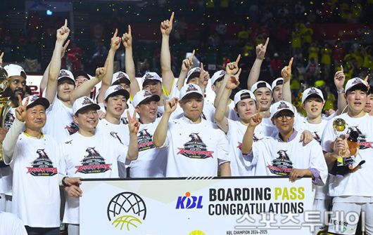 [스포츠투데이 팽현준 기자] 17일 서울 잠실학생체육관에서 열린 2024-2025 남자프로농구 플레이오프 서울 SK와 창원 LG의 챔피언결정전 7차전(7전 4선승), LG가 62-58로 승리하며 우승을 확정했다. LG 선수와 코치진이 기념촬영을 하고 있다. 2025.05.17. [스포츠투데이 팽현준 기자 sports@stoo.com]