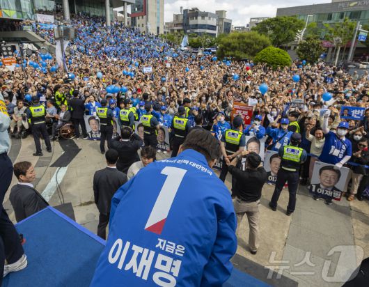 (광주=뉴스1) 이재명 기자 = 이재명 더불어민주당 대통령 후보가 17일 광주광역시 서구 김대중컨벤션센터 광장에서 열린 집중 유세에서 무대에 오른 뒤 시민들에게 인사하고 있다. (공동취재)2025.5.17/뉴스1psy5179@news1.krCopyright ⓒ 뉴스1. All rights reserved. 무단 전재 및 재배포, AI학습 이용 금지.