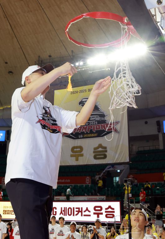 (서울=뉴스1) 김진환 기자 = 17일 오후 서울 송파구 잠실학생체육관에서 열린 '2024-25 KCC 프로농구 챔피언결정전 7차전' 서울 SK 나이츠와 창원 LG 세이커스의 경기, 62대58로 승리하며 창단 28년 만에 첫 우승을 달성한 창원 LG 조상현 감독이 그물을 자르고 있다. 2025.5.17/뉴스1