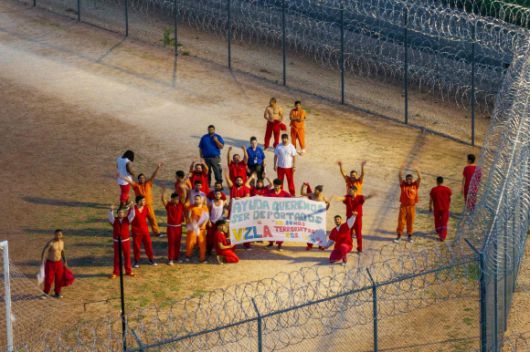 텍사스주 앤슨에서 블루보넷 구치소의 안뜰에서 수감자들이 “우리는 테러리스트가 아닙니다, S.O.S.”라는 현수막을 내걸고 있는 모습이 항공 사진으로 포착됐다. 미국 연방 이민세관단속국(ICE)은 불법 이민자 구금자들을 블루보넷 구치소로 이송하기 시작했다. 기사와 직접적인 관련 없음. 2025.5.13 AFP 연합뉴스 |