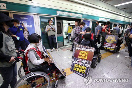 (광주=연합뉴스) 천정인 기자 = 지하철 탑승 시위를 해온 전국장애인차별철폐연대(전장연)가 5·18 전야제가 열리는 광주에서도 지하철을 지연시켜 시민들이 불편을 겪었다.