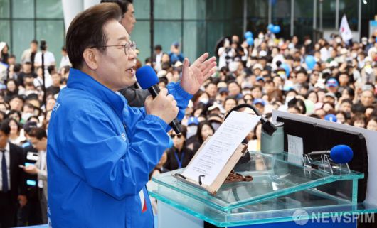 [광주=뉴스핌] 이형석 기자 = 이재명 더불어민주당 대선 후보가 17일 수많은 인파가 운집한 광주 서구 김대중컨벤션센터 광장에서 지지를 호소하고 있다. 2025.05.17 leehs@newspim.com |