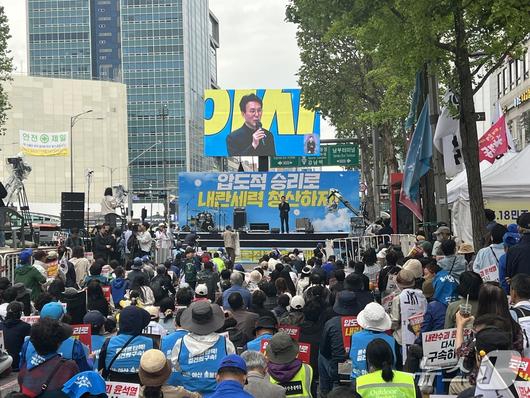 무대에 오른 김민석 더불어민주당 국회의원은 윤 전 대통령의 탈당 소식에 대해 "오늘 황당한 뉴스를 접했다"며 "아직도 출당도 안 하고 징계도 안 했는지 참으로 정신없는 당이라는 생각에 황당했다"고 비판했다.
