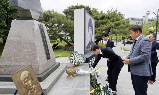 17일 전북대학교에서 열린 이세종 열사 추모식에서 김관영 전북도지사 등이 헌화하고 있다. 전북도 제공