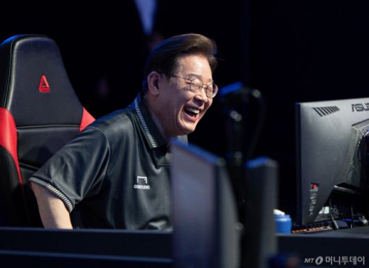 [광주=뉴시스] 조성우 기자 = 이재명 더불어민주당 대선 후보가 17일 오후 광주 동구 조선대학교에 위치한 광주이스포츠경기장에서 열린 'K-콘텐츠e스포츠 LEVEL UP!' e스포츠 산업 현장간담회에서 게임 '리그오브레전드'를 체험하던 중 미소를 짓고 있다. (공동취재) 2025.05.17. photo@newsis.com /사진=김근수 |