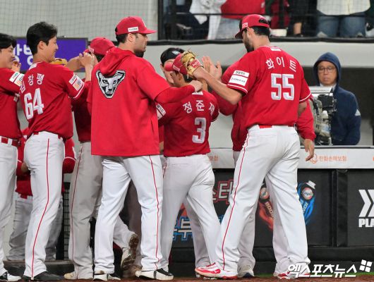 (엑스포츠뉴스 대전, 김한준 기자) 17일 오후 대전 한화생명 볼파크에서 열린 '2025 신한 SOL Bank KBO리그' SSG 랜더스와 한화 이글스의 더블헤더 2차전 경기, 7회말 수비를 마친 SSG 화이트가 더그아웃에서 하이파이브를 하고 있다.김한준 기자 kowel@xportsnews.com