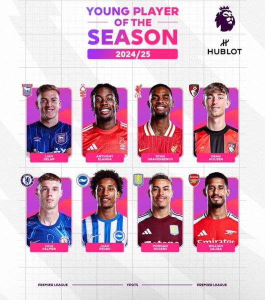 프리미어리그 사무국은 15일(이하 한국시간) 구단 홈페이지를 통해 올해의 영플레이어 후보를 공개했다. 리암 델랍, 안토니 엘랑가, 라이언 흐라벤베르흐, 딘 후이센, 팔머, 주앙 페드로, 모건 로저스, 윌리엄 살리바가 이름을 올렸다.