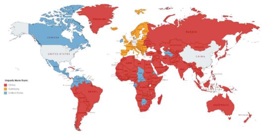 전 세계 나라별 최대 교역국을 나타낸 지도. 빨간색은 중국, 파란색은 미국, 오렌지색은 독일이다. |