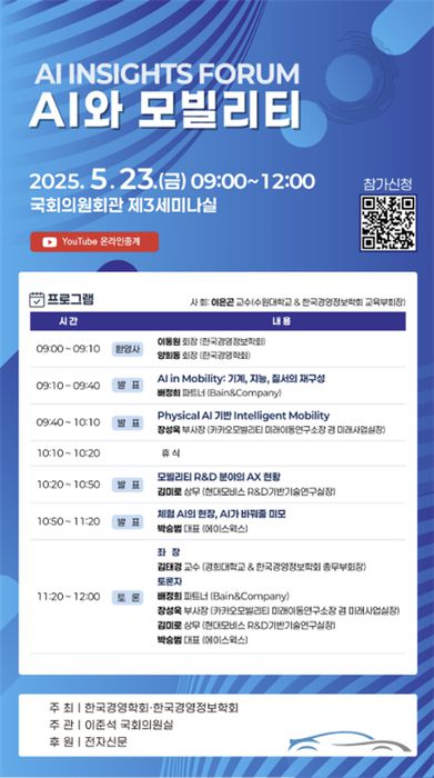 한국경영학회와 한국경영정보학회는 23일 오전 9시부터 국회의원회관 제3세미나실에서 전자신문 후원으로 'AI INSIGHTS FORUM: AI와 모빌리티'를 개최한다.