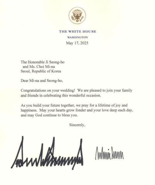 도널드 트럼프 미국 대통령이 17일 지성호 전 국민의힘 의원의 결혼을 축하하는 서한을 보냈다.