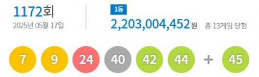 17일 동행복권에 따르면 이날 추첨한 제 1172회 로또 1등 당첨번호는 '7·9·24·40·42·44'로 결정됐다. 2등 보너스 번호는 '45'다.