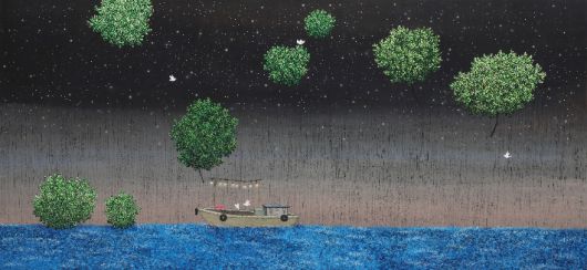 처음엔 무수한 나뭇잎의 나무에 눈이 가다 다시 배경을 보았다. 배경에 남아있는 먹 선이 주는 깊이가 작품이 주는 편안함을 더해 준다.