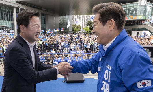 이 후보는 이날 광주 서구 김대중컨벤션센터 광장에서 유세를 펼치던 도중 “어제 (국민의힘을 탈당한) 김상욱 무소속 의원이 민주당과 같이 하기로 했는데 오늘은 김 전 의원이 함께 해주시겠다고 한다”라며 김 전 의원을 호명했다. 그러자 기다리고 있던 김 전 의원이 연단에 올라와 이 후보의 손을 잡고 지지자들에게 인사를 건넸다.