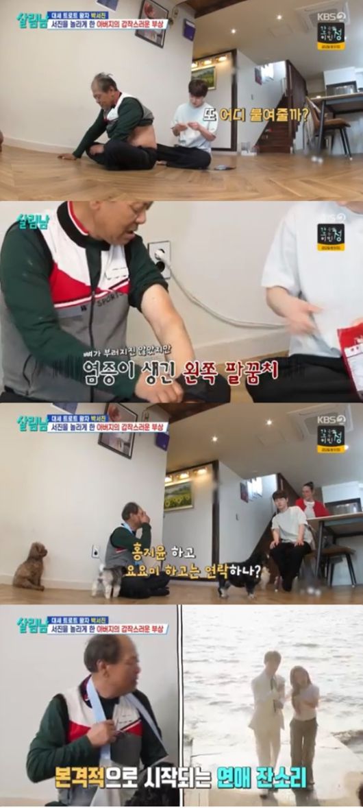 이날 박서진은 아버지 등과 허리 부분에 파스를 붙이고 있었다. 박서진 아버지는 최근 뱃일을 하다가 넘어져 팔을 다친 상태였다. 팔꿈치에 염증이 생겼다고.