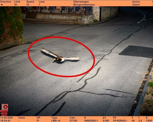 2025년 4월 13일 스위스 베른주 남부 쾨니츠시 과속 단속 카메라에 포착된 청둥오리. 사진=쾨니츠시 경찰 |