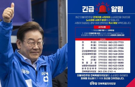 민주당 전북특별자치도당은 17일 입장문을 내고 “최근 전북 지역구 국회의원 보좌진, 당 관계자 등을 사칭한 노쇼가 잇따라 발생하고 있다”며 “이는 이재명 후보의 이미지를 훼손하는 악의적인 행위이자 소상공인들에게 경제적 피해를 주는 악질 범죄”라고 비판했다.