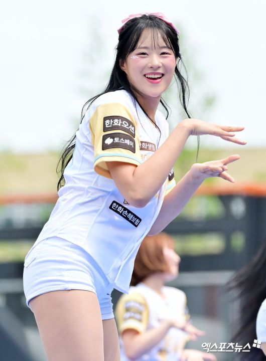 (엑스포츠뉴스 대전, 김한준 기자) 17일 오후 대전 한화생명 볼파크에서 열린 '2025 신한 SOL Bank KBO리그' SSG 랜더스와 한화 이글스의 더블헤더 1차전 경기, 이호은 치어리더가 멋진 공연을 선보이고 있다.김한준 기자 kowel@xportsnews.com