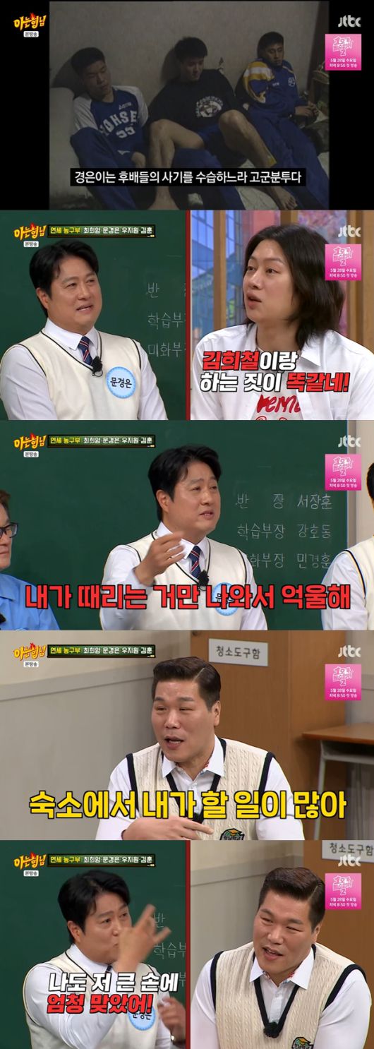 이에 문경은은 "내가 때리는 것만 나와서 억울 나도 큰 손에 엄청 맞았다"라며 억울함을 드러냈다. 서장훈은 당시 숙소에서 1학년이 자신뿐이 없어 할 일이 많았다고 전했다.