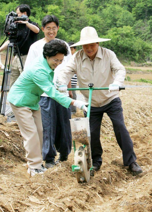 지난 2005년 5월 고 노무현 전 대통령과 권영숙 여사가 단양군 가곡면 한드미마을을 방문해 파종기로 율무를 파종하고 있다. 사진=한드미마을정문찬대표제공 |