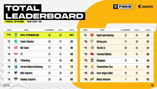DN 프릭스는 이날 열린 6개 매치에서 치킨 1회 및 순위 포인트 20점, 킬 포인트 33점을 기록하며 토털 포인트 53점을 추가했다. 앞서 열린 경기를 포함해 파이널 스테이지 누적 토털 포인트는 97점을 획득했다. 전체 1위에 해당하는 성적이다.