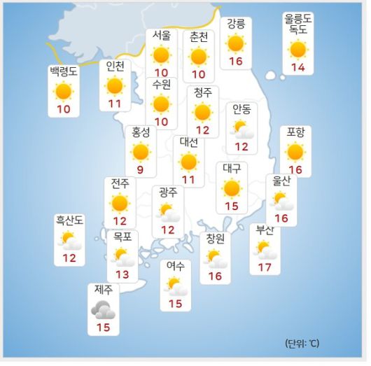 전국 주요 도시별 예상 최저 기온은 △서울 10도 △인천 11도 △춘천 10도 △강릉 16도 △대전 11도 △대구 15도 △전주 12도 △광주 12도 △부산 17도 △제주 15도 △울릉도 독도 14도다.