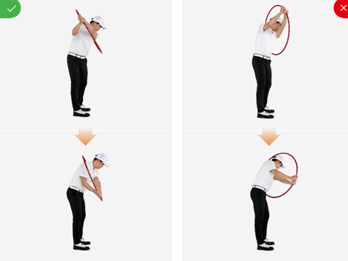 어깨 회전에만 신경을 쓰다가 너무 몸 뒤쪽으로 빼서는 안 된다. 이렇게 하면 다운스윙 때 왼쪽 어깨가 막히면서 임팩트 때 상체를 세우는 얼리 익스텐션 동작이 나올 수 있다. 몸통을 감아주고 손을 올려 정상적인 백스윙 톱 자세가 완성되면 양손이 오른쪽 귀 뒤쪽에 위치하며 가슴은 지면이 아닌 타깃 반대쪽을 향하게 된다.