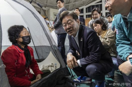 이재명 더불어민주당 대선 후보가 광주 금호타이어 화재 사고 이재민 대피소를 찾았다. 이재민들은 이 후보를 향해 피해를 호소하면서도 이번 대선에서의 승리를 응원했다.