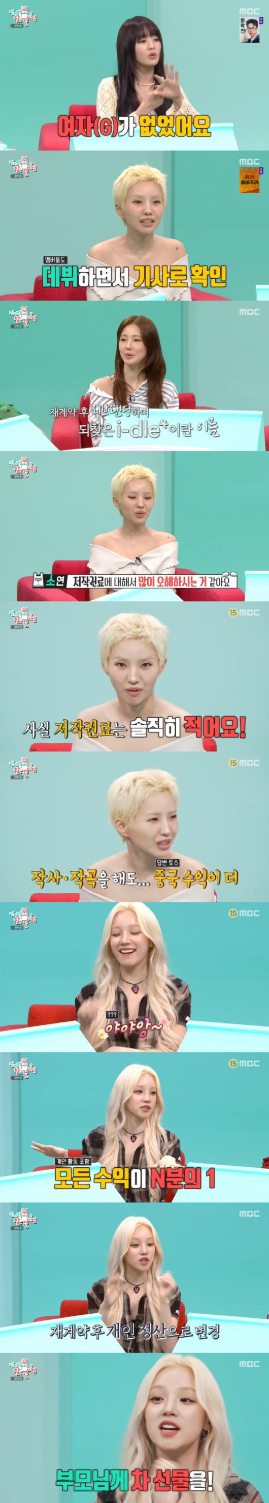그때 홍현희는 "소연 씨가 만든 노래마다 대박이 나지 않았냐. 저작권료가 상상이 안 된다"면서 조심스럽게 물었다. 이에 소연은 "저작권료에 대해서 많이 오해하시는 것 같은데 사실 저작권료 솔직히 적다"면서 "작사, 작곡을 해도 중국 수익이 더 많다"며 답변을 토스했다.