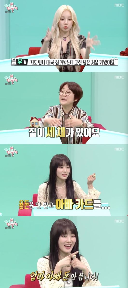 이영자는 “지금은 용돈 안 받겠지만 용돈 최고액은 얼마였냐”라고 물었고 민니는 “용돈은 아니고 아빠 카드를 썼다. 한도 얼마인지 모른다. 그래도 아껴서 썼다. 항상 아빠 카드. 엄마는 리조트 사업을 하고 아빠는 태국 최초 은행 부회장이다. 정산 받고 나서는 엄마 아빠 돈 아예 안 쓴다”라고 답했다.