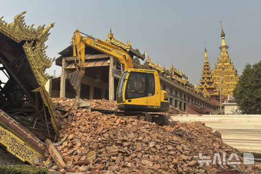 [만달레이=AP/뉴시스] 28일 미얀마 중부 만달레이 인근을 강타한 규모 7.7의 강진으로 무너진 마하르미아트무니 불탑 인근에서 30일 굴착기가 무너진 잔해를 치우고 있다. 2025.03.31 |