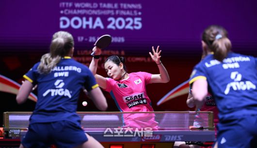 김나영(왼쪽), 이은혜가 17일(현지시간) 카타르 도하 루사일 스포츠 아레나에서 열린 2025 국제탁구연맹(ITTF) 세계선수권대회 여자복식 64강에서 스웨덴 린다 베리스트롬(LINDA BERGSTROM), 크리스티나 켈베리(CHISTINA KALLBERG)조와 경기를 펼치고 있다.