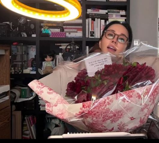사진 속 엄정화는 지인에게 받은 꽃다발을 품에 안고 미소지었다.