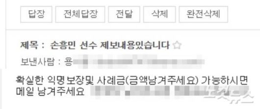 해당 메일에서 용씨는 "증거자료를 가지고 있다. 제보내용 확실하고 여러가지"라며 각종 형태의 자료를 거론했고, 손흥민에 대한 제보를 하겠다며 연락처를 물었다.