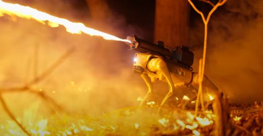 미국의 화염방사기 제조업체 스로플레임이 출시한 화염방사기를 장착한 4족 보행 로봇. 스로플레임 제공 |