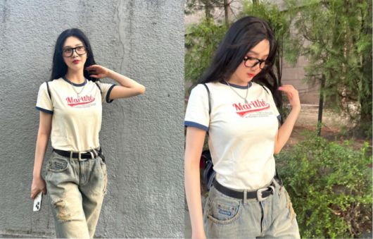 그룹 레드벨벳의 조이는 크림빛 베이스에 네이비 배색이 더해진 링거티와 빈티지 워싱과 데미지 디테일이 가미된 데님 팬츠로 복고풍 무드를 자연스럽게 연출했다. 또한, 심플한 체인 목걸이와 큰 프레임의 안경도 전반적으로 편안한 데일리룩 느낌의 레트로 캐주얼 룩을 완성했다.