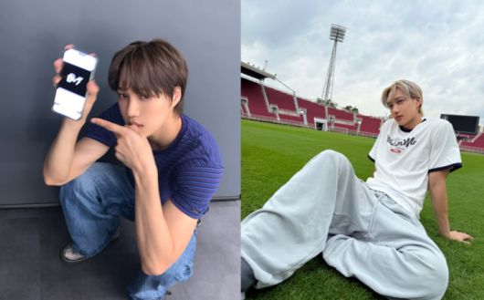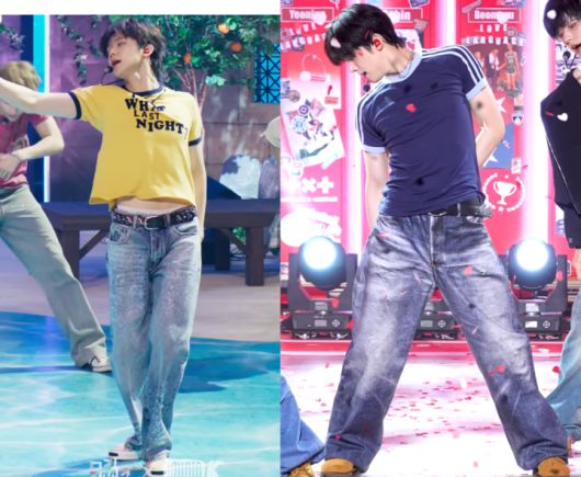 반면, 지난 2024년 7월 MBC '쇼! 음악중심' 현장에서 찍은 것으로 보이는 사진에서는 화이트 바탕에 레드 소매가 포인트인 링거티를 과감한 디스트로이드 워싱 진, 옐로우 컬러의 스니커즈, 베이지 컬러의 로고 캡과 매치하여 보다 힙하고 스트릿한 느낌을 연출했다.