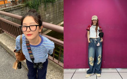 도쿄 여행 중 촬영한 사진 속의 슬기는 파란 배색의 스트라이프 링거티, 네이비 팬츠에 빈티지 감성의 카메라와 크고 투박한 안경을 매치해 조이와 마찬가지로 레트로 캐주얼룩을 완성시켰다. 차분하면서도 산뜻한 색 조합에 스트라이프 패턴의 링거티가 룩에 경쾌함을 더해주며, 내추럴하면서 자유로운 느낌을 연출했다.
