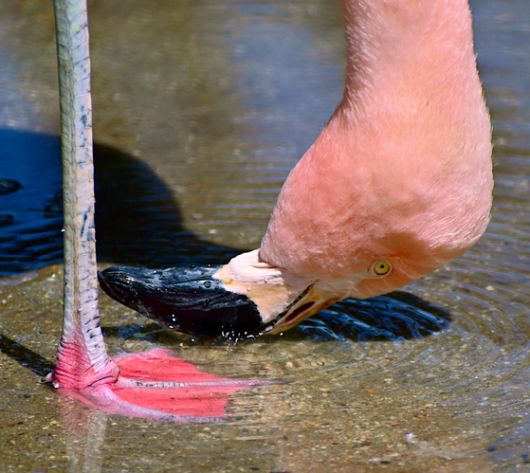 홍학은 이런 특유의 사냥법에 맞게 신체 구조가 특화돼 있다. 부리가 L자형 모양으로 돼 있어 새의 머리가 물속에서 거꾸로 있을 때 바닥과 평행이 된다. 연구팀은 실험 결과 1초에 12번씩 빠르게 부리를 부딪치는 행동이 먹이 포획률을 최대 7배까지 향상시킨다고 밝혔다.