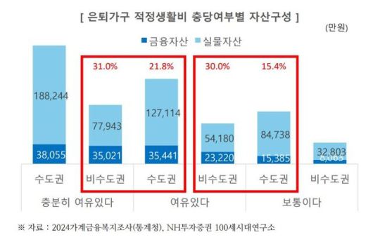 수도권 비수도권의 비교를 통해 알 수 있듯, 순자산이 많아도 적정 금융자산이 확보되지 않으면 은퇴 생활비 조달에 심한 압박감을 느끼게 됩니다.