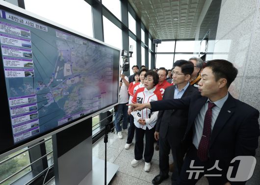 김문수 국민의 대통령 후보가 17일 전북 김제시 한국농어촌공사 새만금 33센터를 방문해 오재준 새만금 사업단장으로부터 새만금 사업 현황에 대한 설명을 듣고 있다. (공동취재) 2025.5.17/뉴스1 ⓒ News1 이광호 기자