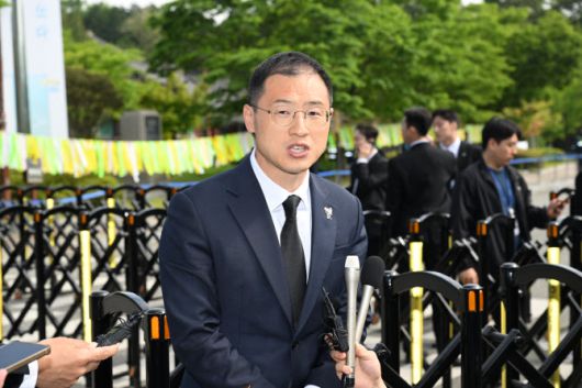 무소속 김상욱 국회의원이 18일 광주 북구 운정동 국립 5·18 민주묘지 민주의문 앞에서 더불어민주당 입당 기자회견을 하고 있다.(사진=연합뉴스)