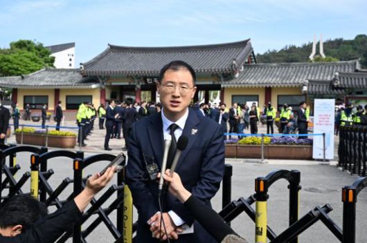 18일 무소속 김상욱 국회의원이 광주 북구 운정동 국립 5·18 민주묘지 민주의문 앞에서 더불어민주당 입당 기자회견을 하고 있다. 연합뉴스 |