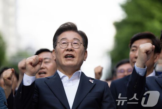 이재명 더불어민주당 대통령 후보가 17일 오후 광주 동구 금남로에서 열린 5·18 광주민주화운동 45주기 전야제에서 구호를 외치고 있다. 2025.5.17/뉴스1 ⓒ News1 이재명 기자 |
