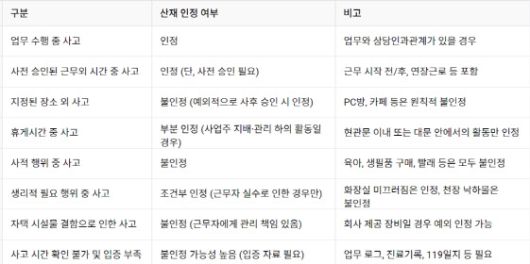 사고 발생 장소가 어디냐도 중요합니다. ‘회사에서 승인하거나 사전에 지정한 공간’이어야 합니다. 회사에는 집에서 일한다고 보고하고 인근 카페에서 업무를 보다가 다쳤다면 산재로 인정받기 어렵습니다.
