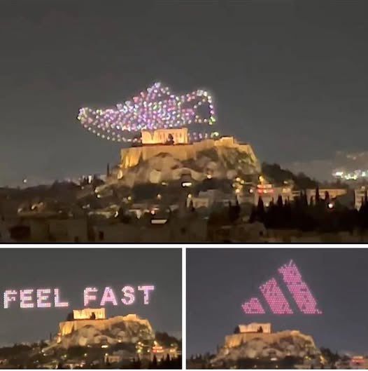 지난 15일(현지 시간) 그리스 자페이온 홀 인근 상공에서 아디다스가 브랜드 홍보를 위한 드론쇼를 진행했다가 현지 문화 유산을 모욕했다는 논란에 휩싸였다. /사진=SNS 갈무리 |