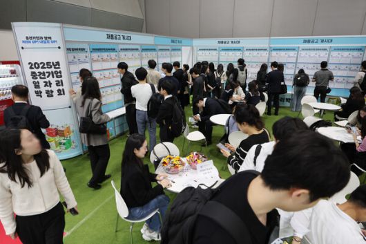 지난달 23일 서울 강남구 코엑스에서 열린 2025 중견기업 일자리 박람회를 찾은 구직자들이 채용공고 게시물을 보고 있다. [사진=연합뉴스] |